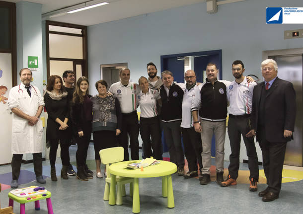 E, tutti insieme, membri della Fondazione e i molti soci della Defense 360, si sono recati al terzo piano, dove si trova il Day Hospital. Qui, i bambini hanno ricevuto in regalo – da parte della società sportiva – magliette, cappellini e portachiavi.