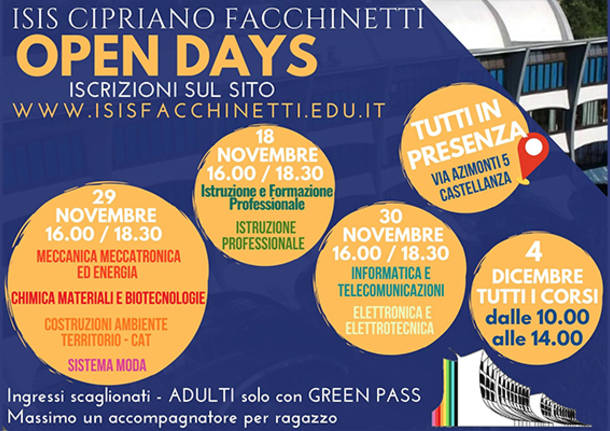 Quest’anno gli open day all’ISIS Facchinetti di Castellanza si svolgeranno in presenza con ingressi scaglionati (limitati in orario e numero di accessi). Gli accompagnatori dovranno essere muniti di green pass.