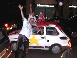 Nel centro della baldoria, piazza Monte Grappa, è successo un pò di tutto. Serpentoni, balli sudamericani, gente che si arrampicava sui semafori o sulle cabine telefoniche per sventolare le bandiere e per godersi il panorama. La banca, persino l’austera banca, aveva le finestre spalancate e dal balcone invece degli impiegati facevano capolino i cappelli carnevaleschi tinti di bianco e rosso. Stasera non c’è giacca e cravatta che tenga.