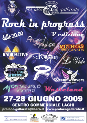 “Rock in Progress” è giunto alla quinta edizione. Una rassegna per gruppi emergenti di buon talento, provenienti in gran parte del territorio. Un evento che ha coinvolto ogni anno numerosi gruppi, con successo artistico e di pubblico. L’intento della Pro Loco di Gallarate è quello di dare spazio e visibilità alle potenzialità artistiche dei giovani, soddisfare le loro esigenze e soprattutto dare loro la possibilità di farsi conoscere. Due serate per promuovere la musica giovane organizzate sabato 27 e domenica 28 giugno dalle 20 al Centro Commerciale dei Laghi. Oltre alla musica stand fisso con bevande e panini e lo stand dell’Avis gruppo giovani. Ad esibirsi sabato 27 saranno “Mothers Against Canada”, “Le Vide”, “Montecarlo Fisting”, “Project Mayhem” e “Neurostar”. Domenica 28 sul palco “Nekrosun”, “Dreamweavers”, “Radioactive”, “Smmak Offline” e “Wasteland”. Per informazioni 0331774968 o proloco.gallarate@libero.it.