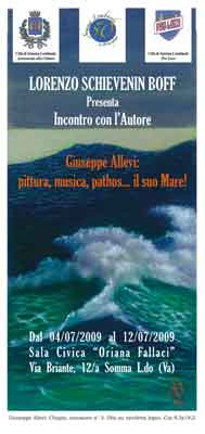 nella sala civica "Oriana Fallaci" in via Briante 12/a a Somma Lombardo.Ma la mostra "Giuseppe Allevi: pittura, musica, pathos…il suo "Mare!", proposta dall’assessorato alla Cultura del Comune di Somma Lombardo in collaborazione con la Pro Loco di Somma Lombardo per la rassegna "Incontro con l’autore" e curata da Lorenzo Schievenin Boff, è anche altro, perché propone un allestimento molto particolare e affascinante, con un sottofondo tutto da ascoltare che unisce il suono delle onde del mare alle note di Notturni di Chopin.