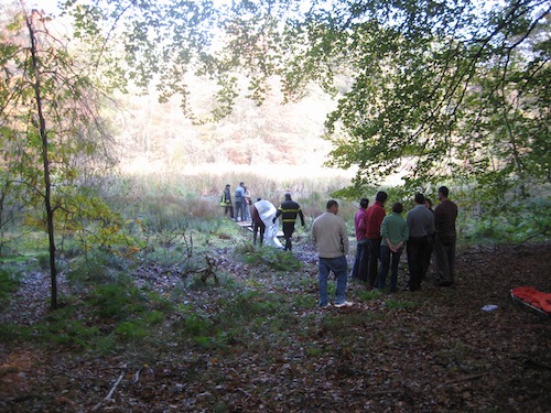 Il riconoscimento del corpo in tarda mattinata, dopo il ritrovamento da parte di due fotografi. Sommozzatori al lavoro. La zona è un acquitrino a un chilometro dall’agriturismo “La Rinascita”. I famigliari dell’uomo sul posto