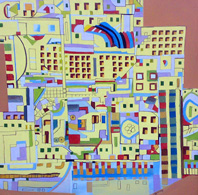 “Una pittura ordinata, prosegue Fabrizio Galli, precisa, concreta, che traccia linee coerenti ma geometricamente assurde inventando paesaggi urbani impossibili e nello stesso tempo vivibili in una dimensione fantastica dove l’uomo, non rappresentato, è solo di fronte alla propria solitudine, alieno ma non alienato, pronto a mettersi in gioco, ad immergersi in policromie giocose alla ricerca della infantile spensieratezza.