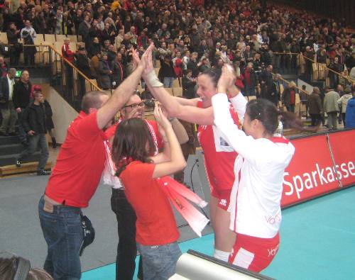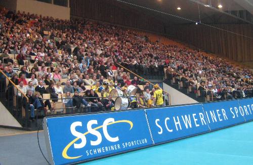 Alla fine sul campo dello Sport und Kongresshall di Schwerin ci sono i tifosi (nella foto, con Campanari e Kim) venuti fin qui dalla lontana Busto Arsizio a seguire la Yamamay: le farfalle hanno appena centrato un traguardo che rimarrà nella memoria, qualificandosi alla prima finale europea della loro storia. Nella sfida con lo Schweriner paure, brividi e complessi della vigilia si sono concentrati in un disastroso primo set che ha fatto temere il peggio; poi però le biancorosse hanno saputo riprendersi subito, lavorando sui propri punti deboli (dalla ricezione alla battuta) e trasformandoli in armi per disinnescare le certezze delle tedesche. Strepitosa Turlea (22 punti con il 45% in attacco), ma brave tutte le ragazze di Parisi a lottare a muro (12 punti) e in difesa su ogni pallone, dimostrando il carattere che a volte era mancato nelle ultime gare. Ora la final four del 20 e 21 marzo dove la Yamamay troverà le azere del Baku, mentre nell’altra semifinale ci saranno la Stella Rossa e la vincitrice dell’ultimo quarto tra Ekaterinburg e Costanta, in programma giovedì: il sogno, neppure troppo segreto, è quello di poterla ospitare proprio a Busto Arsizio.LA PARTITA – Sestetti titolari per entrambe le squadre e clima straordinario al palasport di Schweriner (nella foto) gremito di tifosi. Inizio in equilibrio con lo stesso copione dell’andata: difese efficaci, scambi lunghi e battute spesso decisive.