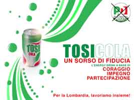 «Per chi andrà alle urne con una grande sete di cambiamento, ma è stanco della politica all’acqua minerale. Per giovani e anziani, donne e uomini, dipendenti e autonomi, single o sposati. Per chi non ricerca magiche promesse, ma risposte concrete, competenza, ascolto il 28 e 29 marzo c’è una grande novità. Arriva l’energy drink per votare con fiducia nel futuro.Ma la ricetta non è segreta: gli ingredienti sono coraggio, impegno, partecipazione dei cittadini “TosiCola”, un sorso di fiducia con Stefano Tosi, “Lavoriamo insieme per la Lombardia”».