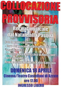 L’hanno intitolato "Collocazione provvisoria", il recital che domenica 18 aprile alle 17 andrà in scena per la prima volta al Cinema Teatro Castellani di Azzate. Il recital nasce dall’idea di dare vita a un’esperienza musicale per bambini, ragazzi e giovani del decanato di Azzate legata al percorso di fede che essi stanno seguendo nelle varie realtà che frequentano. E così dall’unione del coretto della parrocchia di Morazzone, di un gruppo musicale che da anni segue la preparazione di un concorso canoro (l’Ambrogino) sempre della parrocchia di Morazzone, del coro dei giovani del decanato di Azzate "Semi di luce" e di altri amici musicisti, registi, fonici, … è nato il gruppo che porterà in scena "Collocazione provvisoria".