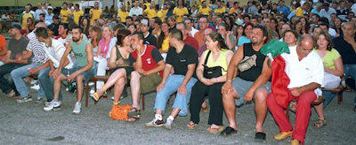Il bar in questione era fuori dal tendone, da lì si poteva solo intravedere mezza spanna della parte inferiore dello schermo. Su 300 persone ero probabilmente l’unico al quale quella mezza spanna sembrava più che sufficiente. A patto di sentire le urla del pubblico: di gioia, di dolore. Molto spesso parolacce.