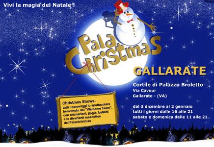 Domenica 5 dicembre verrà inaugurato il PalaChristmas (www.palachristmas.com) nel Cortile di Palazzo Broletto (via Cavour) che sarà interamente dedicato alla magia Natale Giochi di luci, effetti speciale ed un ricco e suggestivo allestimento faranno da cornice al primo villaggio di Natale di Gallarate. Il PalaChristmas è infatti strutturato come le famose piazze del nord europa, in cui trovano spazio un Mercatino di Natale, gli Chalet della Ristorazione Tematica, una grande pedana centrale per gli spettacoli e le animazioni quotidiane.