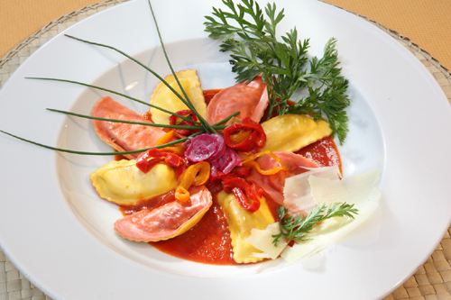 Cuocete i pomodori, precedentemente spellati, con un filo d’olio e basilico. Frullateli fino ad ottenere una crema. Mondate e tagliate i peperoni a piccole falde, stufateli in olio e maggiorana. Cuocete i galletti in acqua salata, scolateli bene e saltateli con i peperoni e una noce di burro. Disponete la crema di pomodoro a specchio nel piatto e adagiatevi i ravioli. Finite il piatto con una spolverata di parmigiano.