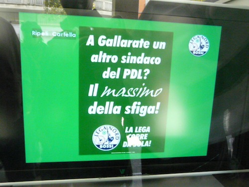 che ha assicurato pieno appoggio (era presente). Quanto a Stefano Gualandris – che compiva oggi 33 anni, ha una moglie e tre figli – indica i temi principali in «urbanistica, difesa dei più deboli, cultura, attenzione ai conti pubblici». Spiega che sta «ancora valutando la lista» e che si pensa anche «ad una lista civica d’appoggio», una scelta anomala per un partito fortemente indentitario come la Lega. Se si arriverà al ballottaggio? «Ci penseremo al momento del ballottaggio, ma non ci sono ipotesi di fare accordi». La campagna elettorale in competizione con il PdL si intuisce già dai manifesti, ironici e aggressivi.