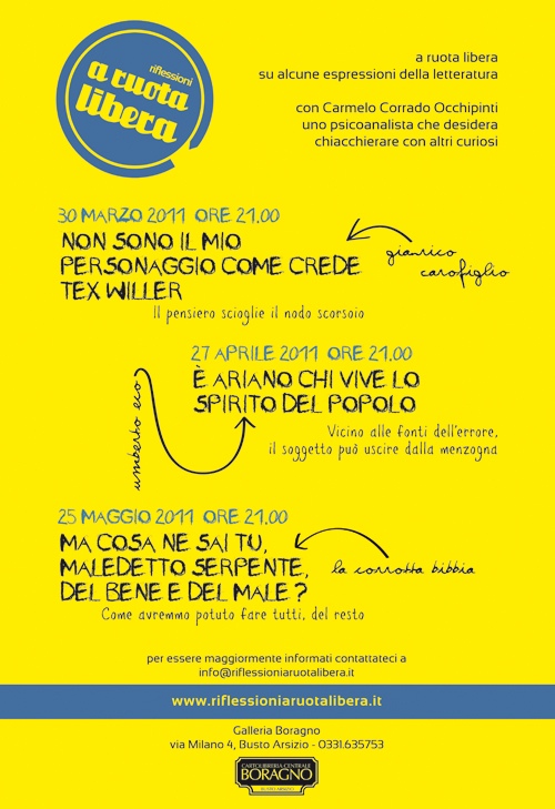 Dopo la buona accoglienza riservata al primo ciclo di incontri, torna alla Galleria Boragno di Busto Arsizio l’appuntamento con “Riflessioni a ruota libera”: tre serate condotte dallo psicoanalista Carmelo Corrado Occhipinti che ragionerà insieme al pubblico presente in sala sulle tematiche universali del pensiero umano.