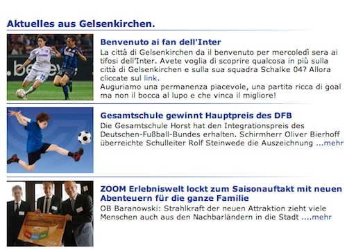 L’italiano non è perfetto ma quasi quasi ci siamo. E l’idea è ottima e forse anche le città italiane dovrebbero imparare ad attirare la simpatia dei turisti stranieri imparando un po’ le lingue. «Avete voglia di scoprire qualcosa in più sulla città di Gelsenkirchen e sulla sua squadra Schalke 04? Allora cliccate sul link. Auguriamo una permanenza piacevole, una partita ricca di goal ma non il bocca al lupo e che vinca il migliore!
