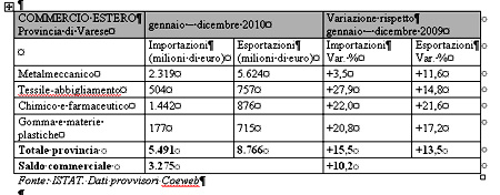 EXPORT-IMPORT: I DATI DEFINITIVI DEL 2010. Gli ultimi dati disponibili sul commercio estero varesino, relativi all’intero anno 2010, confermano una ripresa e una dinamicità dei flussi commerciali.