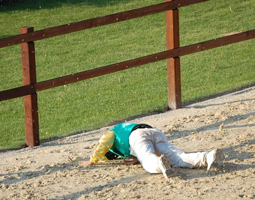 brogio parte allo steccato, San Domenico, La Flora, San Bernardino al largo. Tre mosse false. Alla quarta, ancora falsa, il fantino della Flora viene disarcionato e calpestato, ma zoppicante risale a cavallo. Quinta mossa, nulla di fatto. La sesta è buona. In testa c’è Sant’Ambrogio a seguire gli altri secondo l’ordine di partenza. Al secondo giro, però, il fantino di Sant’Ambrogio cade e rimane sul campo immobile. I cavalli continuano a girare, ma Silvano Mulas è ancora a terra privo di sensi. Sarà solo il tempestivo intervento di alcune comparse, che trascineranno il fantino oltre lo steccato, a evitargli gli zoccoli degli altri cavalli. L’ordine di arrivo è: Sant’Ambrogio, La Flora, San Bernardino, San Domenico. Sant’Ambrogio correrà la finale con il fantino di riserva: Leonardo Chessa. Mulas verrà trasportato all’ospedale per accertamenti. (Guarda la fotosequenza)