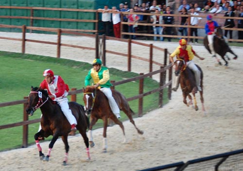 Alle 20 la finale non è ancora partita. Nel tramonto che incombe sul Mari, si sentono solo le urla del mossiere: «allargarsi… stringersi… fare… spazio… Sant’Ambrogio non va bene… San Magno stai largo». A questo punto ci vorrebbe un ex voto, ma la campanella si abbatte inesorabile anche sulla terza mossa. Parte un coro «scemo, scemo» e il mossiere risponde decretando una pausa. I cavalli non hanno ancora corso la finale, ma è come se ne avessero corse tre, tanto è il sudore che imperla il loro manto. Alla quarta mossa si sfiora di nuovo la tragedia: il canapo si abbassa, il cavallo della Flora si siede letteralmente sui posteriori schiacciando per la seconda volta il povero fantino che si trascina sotto il palco del mossiere per ricevere soccorsi. Altra lunga pausa per permettere a Siri di riprendersi. Ore 20 e 35, quinta partenza falsa. La mossa delle 20 e 40 è quella buona: San Magno parte in testa, seguita da Sant’ambrogio, Legnarello e la Flora. Sarà questo l’ordine di arrivo finale del Palio.