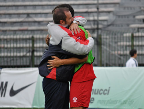 Nel dopopartita c’è da commentare una pagina amarissima della storia del Varese. Il primo a farlo è Devis Mangia (nella foto di Valeria Pisano), al suo ultimo giro di taccuini in biancorosso (come noto si trasferirà a Palermo dove guiderà la Primavera rosanero): «Cosa ci è mancato stasera? 10 secondi. Non posso augurare a nessuno quello che è successo: avevamo il campionato italiano in mano. Adesso c’è grande amarezza ma ciò che è stato detto tutto l’anno vale anche oggi: bisogna interpretare i momenti difficili come momenti di crescita. Non è facile, ma dobbiamo farlo». La direzione di gara non ha convinto e i due episodi favorevoli alla Roma (il dubbio angolo in occasione del 2-2, il tocco di mano da cui è iniziata l’azione del 3-2) hanno pesato sul risultato: «Non ho intenzione di commentare queste cose – spiega il tecnico –, purtroppo il calcio è così e va accettato: sarebbe naturale farlo, ma non voglio. Complimenti alla Roma che ha vinto, un applauso più grande va però ai miei giocatori: è giusto che questi ragazzi rimangano nel cuore di Varese. Speravamo di fare ancora di più, ma credo che un piccolo regalo alla città lo lasciamo lo stesso. Quest’anno è successo qualcosa di incredibile: tantissime storie diverse si sono trovate insieme e hanno dato vita ad una storia ancor più straordinaria. Siamo diventati una squadra, un gruppo unito dentro e fuori dal campo, abbiamo raggiunto la semifinale del Torneo di Viareggio e la finale Scudetto. Ai miei ragazzi dirò: bravi, avete fatto qualcosa di unico. In questi giorni voglio stare ancora con loro, poi dirò arrivederci a Varese: arrivederci, perché questa è casa mia e non gli dirò mai addio». Ripartire dai ragazzi della Primavera in prospettiva Prima squadra: si può? «Questi ragazzi hanno potenzialità: penso che alcuni siano già pronti per la prima squadra, altri hanno bisogno di fare ancora esperienza. Questi devono avere la fortuna di avere per un anno o due una persona che insegni, che li guidi nei momenti positivi e in quelli negativi. Per alcuni potrebbe essere positiva anche un’esperienza in una Prima divisione. La cosa più importante però è dare fiducia a chi viene tenuto; non deve succedere che alla prima difficoltà si pensi allora che non sono pronti». Anche il direttore Giorgio Scapini (nella foto di Fabrizio Riboni insieme a Devis Mangia) è affranto per l’amaro finale, ma l’orgoglio per quanto fatto prende subito – e giustamente – il sopravvento: «Adesso c’è rammarico e anche da recriminare: l’angolo non c’era, il fallo di mani sul terzo gol è evidente. Ma si sa, il calcio dà e toglie. È stata una favola ma con un brutto finale. Domani ci sveglieremo senza Scudetto, ma sicuri di essere i vincitori morali; domani penseremo che siamo stati tutti meravigliosi. Sappiamo che è difficile che possa ricapitare, ma noi proveremo a farlo succede ancora. Si è chiuso un ciclo, anche con la Prima squadra: ripartiamo. Il Varese ha un grande cuore e questo ci fa sperare per il futuro. Fa piacere che tutti i tifosi neutrali tifassero per noi: Varese esce con un’immagine di una squadra che chiude si al secondo posto, ma con la testa altissima e la consapevolezza che meritava di più. Oggi siamo tristi, ma domani saremo orgogliosi. Forza Varese». A nome del Gruppo parla Matteo Bianchetti, capitano biancorosso: «È dura. Perdere così poi dà fastidio: abbiamo commesso degli errori, sicuramente, ma la Roma ha avuto qualche situazione favorevole di troppo. Siamo dispiaciuti, anche se a settembre nessuno poteva pensare di arrivare fin qui. Rimane comunque una stagione indescrivibile di un gruppo magnifico dentro e, ancor di più, fuori dal campo. È stata la stagione più bella della mia vita».