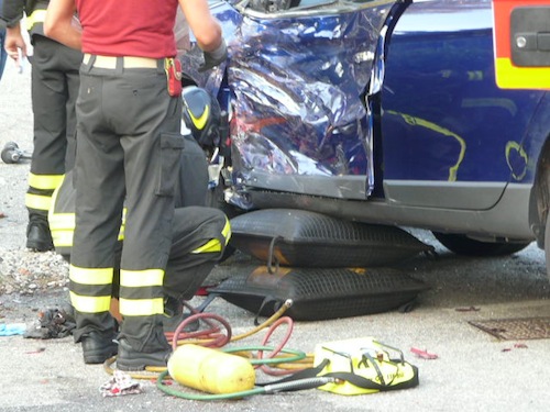 (una Lancia) che stava svoltando in una via secondaria: entrambi i veicoli venivano dal centro di Buguggiate. La moto è rimasta incastrata sotto l’auto, che si è scontrata anche contro un’altra macchina in quel momento ferma in una rientranza della strada, con una persona a bordo. L’uomo alla guida della moto – che aveva 32 anni – è rimasto schiacciato con la testa sotto l’automobile, tra la ruota anteriore e il paraurti: per estrarlo i vigili del fuoco sono intervenuti con un cuscino gonfiabile (nella foto), per sollevare lentamente il veicolo e spostare la persona, che non è riuscita a superare la notte. Sono rimasti pressoché illesi i tre occupanti delle due automobili coinvolte, due uomini e una donna, medicati sul posto.
