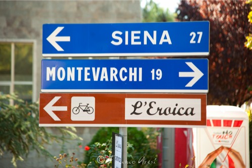 Quest’inverno sentii parlare su un sito di una gara ciclistica di altri tempi chiamata “Eroica”, una corsa che si corre su strade bianche nella zona del Chianti con abiti e biciclette d’epoca, unica regola tassativa è il possedere una bicicletta costruita entro il 1987 che abbia parti originali e un abbigliamento adeguato, pena la squalifica. Inizialmente la cosa non andò oltre il fatto di cronaca, se nonché in primavera durante un mio tour motociclistico capitai dalle parti di Gaiole in Chianti, trovai traccia nei cartelli dell’Eroica, presi visione di alcuni sterrati, mi informai sulla gara ed ecco che alla notte partì “la scimmia” in volo pindarico: perché non raccontare da dentro con le foto questa incredibile gara? Tornato a casa, sempre più convinto, iniziai la preparazione fisica, anche perché nonostante la possibilità di scegliere il percorso più breve – 38 km – (gli altri erano 75, 135 e 205 km.) le salite tremende e il fondo ghiaioso avrebbero stroncato chiunque a digiuno di allenamento. Ben presto però la realtà mi riportò pesantemente a terra, il mio ginocchio non era nelle condizioni giuste, la diagnosi non fu confortante: niente sforzi prolungati in quanto i menischi avevano ceduto. La sera invece che portare consiglio portò altre notizie pessime: ragionando su come procedere, mi resi conto di quanto mi ero sopravvalutato, perché anche se fossi stato allenato, sarei finito a raccontare fotograficamente solo le schiene di tutti i partecipanti che immancabilmente mi avrebbero superato (ammesso che fossi riuscito a partire con i primi).