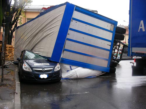 Incidente, fortunatamente senza gravi conseguenze, attorno alle ore 16 di oggi, martedì, quando il rimorcho di un autoarticolato si è ribaltato in curva schiacciano una Opel Corsa della scuola guida. Il pesante mezzo si è prima districato tra le viuzze attorno alle scuole Crespi poi, una volta arrivato in largo San Giuseppe, il rimorchio – probabilmente a causa del carico riposto male – si è ribaltato sul marciapiede schiacciando l’auto in sosta. L’insegnante e l’allievo che si apprestavano ad una lezione di guida erano all’interno, ma sono miracolosamente riusciti ad uscire dall’auto, un po’ acciaccati, ma sani e salvi.