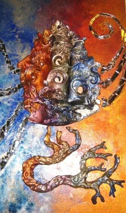 Su un repertorio iconografico personale ormai consolidato, ultimamente Elisabetta Pieroni ha imbastito un’appassionata ricerca tecnica e polimaterica; le iridescenze date dai nuovi smalti impiegati dialogano con materiali estranei all’ambito ceramico come frammenti di specchio, inserti di rame e ottone, supporti in plexiglass trasparente e aeree spirali realizzate con il filo di ferro.