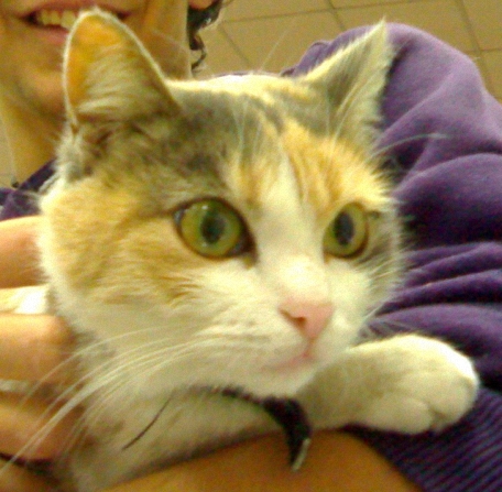 Si tratta di una gattina bianca grigia e rossa, giovane e molto affettuosa. Indossa un collarino di velluto nero, ma non riporta il nome o numero di telefono.