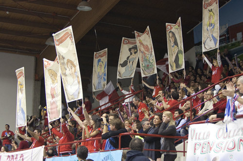LA CORNICE – All’apertura dei cancelli ancora qualche prevedibile polemica sull’assegnazione dei posti in curva ai tifosi della Yamamay, che si sono procurati un’altra ottantina di tagliandi oltre ai 155 messi a disposizione della società. Alla fine la macchia biancorossa sugli spalti è imponente e i bustocchi vincono per distacco anche la battaglia degli striscioni, per la verità un po’ in sordina rispetto al passato. Al classico “Divieto di sorpasso permanente” si aggiungono la beffarda locandina del “Sogno di mezza estate” di Villa Cortese (lo scudetto sfumato al Forum) e una fantasiosa rappresentazione della “Squadra da favola”, con le giocatrici nei panni di altrettante eroine disneyane. Ce n’è ovviamente anche per l’ex Carocci: “A voi la Luna, a noi le stelle”. Risponde la tifoseria di casa con l’eloquente “Il più grande spettacolo siamo noi”; a sostenere Villa c’è anche, tra i tanti VIP, l’americana Stacy Sykora.