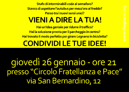“Il PGTU di cui si vuole dotare Legnano è adeguato o è migliorabile? È proprio quello di cui ha bisogno la nostra città?”. Il primo appuntamento è fissato per giovedì 26 Gennaio alle ore 21 presso il “Circolo Fratellanza e Pace” di via S. Bernardino, 12.