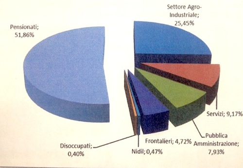 sindacato con il 52% sul totale degli iscritti. Un altro 25% è relativo ai lavoratori impiegati nel settore agro-alimentare, il 9% nei servizi, il 7,93% nella pubblica amministrazone, il 4,72% sono lavoratori frontalieri, lo 0,47% sono lavoratori precari e lo 0,40% disoccupati.