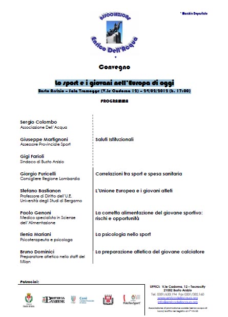 Sport e giovani? Due realtà che dovrebbero andare di pari passo, ma non sempre è così. Per questo l’Associazione Enrico dell’Acqua insieme alla Provincia di Varese, al Comune di Busto e al Coni ha organizzato un convegno dedicato a questo tema. L’appuntamento con "Lo sport e i giovani nell’Europa di oggi" è il 24 febbario alle ore 17 a Busto Arsizio nella Sala Tramogge (viale Cadorna 12).