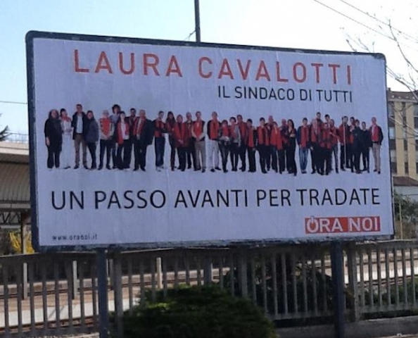 Nelle ultime ore è comparso un manifesto del gruppo di centrosinistra (Pd, Sel, Idv, Partecipare Insieme) che sostiene Laura Cavalotti e che da tempo adotta lo slogan “Ora Noi”. Sul grande manifesto la scritta “Un passo avanti per Tradate”. La Lega Nord si è letteralmente infuriata: costretta a uscire allo scoperto ha convocato una conferenza stampa d’urgenza. Gli adesivi con lo slogan “Un passo avanti” facevano parte di una precisa campagna del Carroccio, il cui secondo passaggio era l’uscita di manifesti anonimi col solo la sagoma di una persona con un punto di domanda, accompagnato dal misterioso slogan.
