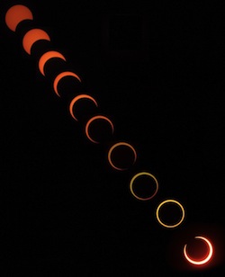 Le eclissi di Sole non sono sempre totali: se la Luna in quei giorni si trova all’apogeo (punto più lontano dalla Terra) la vediamo leggermente più piccola, e di conseguenza non riesce ad oscurare completamente il Sole, lasciandone scoperto un anello tutto attorno: è per questo che l’eclisse si dice "anulare".