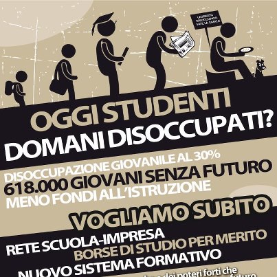 174Secondo i dati diffusi dall’ISTAT nel mese di Luglio – afferma il responsabile provinciale di Avanguardia studentesca Manuel Sirsi – la disoccupazione giovanile è schizzata al 30%, il 7,4% in più rispetto allo scorso anno, parliamo di 618 mila ragazzi senza lavoro, e dal governo dei tecnici non c’è alcun segnale di rilancio dello sviluppo che porti alla creazione di nuovi posti di lavoro per i giovani».