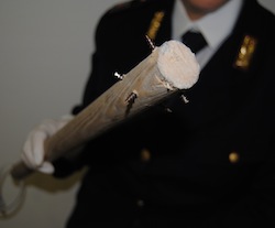 Il controllo di polizia, esteso al mezzo di trasporto, ha fatto ritrovare, a portata di mano anche se ben nascosto tra i due sedili anteriori, una sorta di “mazza ferrata” di fabbricazione artigianale, ricavata da un grosso bastone – probabilmente il manico di una vanga – con un’estremità attraversata da alcune viti in modo da renderla particolarmente pericolosa. L’uomo, un tunisino di 40 anni già noto alle Forze dell’Ordine, è stato denunciato, oltre che per le minacce e le ingiurie indirizzate alla donna ed al suo amico, per il porto dell’arma impropria.
