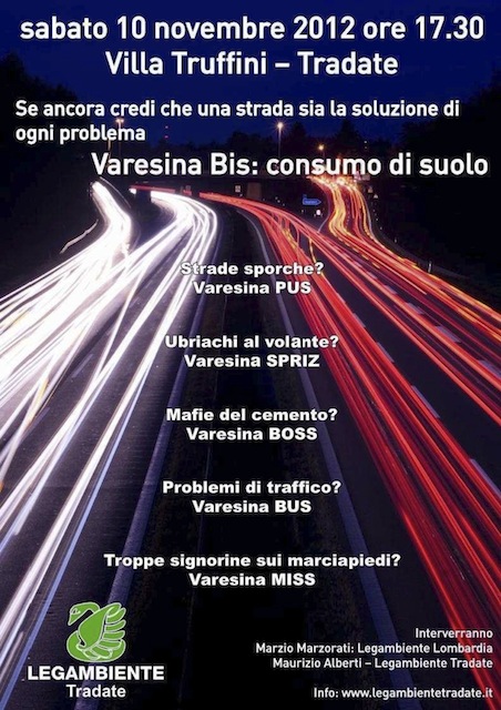 «Ci siamo: dopo anni e anni la Varesina bis è ai blocchi di partenza – spiegano gli organizzatori -. Passerà anche da Tradate cancellando altra campagna e dando vita a nuove e inutili edificazioni. Ma è davvero indispensabile? Legambiente Tradate ne parlerà in una conferenza sul consumo di suolo con Marzio Marzorati (Legambiente Lombardia, Responsabile progetto Custodi del Territorio) e Maurizio Alberti (Legambiente Tradate, Presidente della commissione comunale ambiente)».