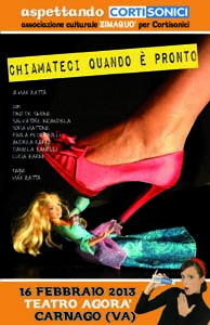 Sabato 16 presso il Teatro Agorà di Carnago (piazza S. Giovanni Bosco) si terrà lo spettacolo “Chiamateci quando è pronto” della neonata associazione Zimaquò. Uno spettacolo dove funzionerà la formula “La cultura finanzia la cultura!”. Cortisonici, il festival del cortometraggio varesino, ha chiamato e Zimaquò ha risposto. Un’opera completamente nuova, scritta dal capobanda del gruppo Zimaquò viene messa in scena a Carnago per raccogliere fondi e correre in aiuto di Cortisonici e del festival internazionale di cortometraggi varesino, che, quest’anno più che mai, deve far fronte ai tagli che la crisi ha imposto ai finanziamenti pubblici. La crisi morde, ma Cortisonici non molla. Vuole continuare ad essere quello che è sempre stato: un festival gratuito ed aperto a tutti gli appassionati.