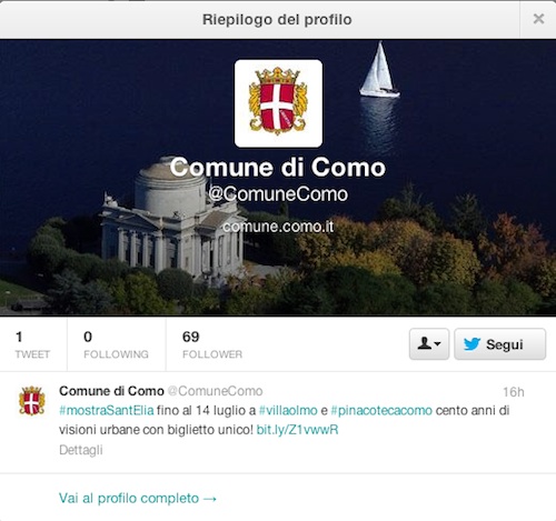 Anche il comune di Como sbarca su twitter: e per cominciare sceglie le informazioni sulle sue mostre in villa. Il primo tweet inviato dal suop nuovo account @comunecomo, nel tardo pomeriggio di ieri, 25 marzo 2013, si rifà infatti alla nuova grande mostra organizzata dal Comune di Como “La Città Nuova. Oltre Sant’Elia. Cento anni di visioni urbane”, appena inaugurata a Villa Olmo.