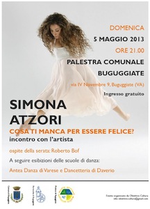 Simona Atzori rivela in questo libro di essere felice, "smodatamente, spudoratamente felice" per quanto ha realizzato nella sua vita. Chi ci ha dato l’idea che per essere felici dobbiamo per forza avere tutto? Grazie a due genitori straordinari (la madre è deceduta il 24 dicembre scorso), Simona ha superato il suo limite, trasformandolo in una forza immensa, che la ha consentito di sviluppare tutte le sue qualità. Le sue braccia non ci sono, ma per questo sono diventate "quattro, poi otto, poi mille e poi infinite, perché hanno il desiderio di accogliere tutte le braccia che hanno il desiderio di donarmi il loro amore." Simona non danzerà: il pubblico assisterà alla proiezione di un filmato sulle sue molteplici attività, e la ascolterà parlare di se stessa e del suo libro. In suo onore, le allieve di due scuole di danza , ospiti della serata, si esibiranno per lei e per gli spettatori: Antea Danza di Varese presenterà brani di classica e contemporanea, Dancetteria di Daverio brani tratti dal musical "Alice nel Paese delle Meraviglie”.