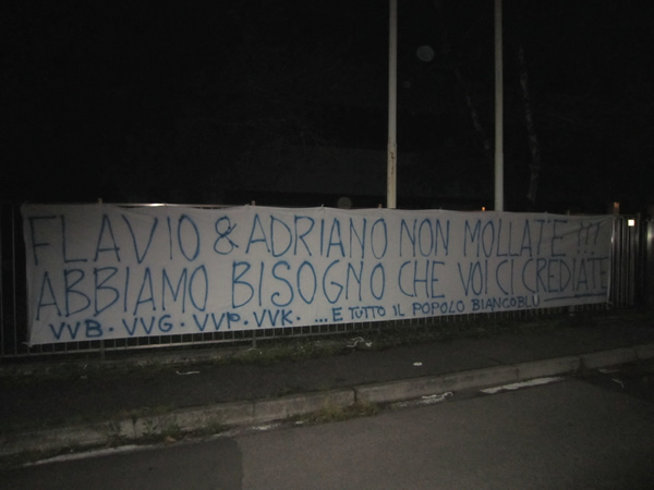 Blitz notturno dei supporter biancoblu alla sede della PietroCarnaghi: esposti due striscioni di incoraggiamento alla società. "Non possiamo arrenderci così" dicono i Boys, ma si avvicina la cessione del diritto sportivo