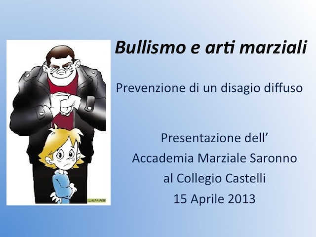Lunedì 15 aprile, dopo una breve presentazione con delle slide per inquadrare il fenomeno del bullismo, i rappresentanti dell’Accademia Marziale Saronno hanno invitato i ragazzi riuniti in assemblea a salire sul palco per sperimentare di persona alcune tecniche base di autodifesa e spiegare come le arti marziali possano rivelarsi utili nella prevenzione di questo diffuso fenomeno giovanile. «L’idea non è certo quella di dire "divento forte così picchio io il bullo"! – ha spiegato il Maestro Carpanese – Praticando arti marziali si acquisisce maggiore fiducia in se stessi e nelle proprie possibilità, si diventa meno timidi e, di conseguenza, diminuiscono le probabilità di diventare una vittima designata», ma altrettanto importante è ciò che queste discipline possono fare per i potenziali bulli: «Attraverso le arti marziali si impara il rispetto di se e degli altri, la disciplina, il valore delle regole; si capisce l’importanza della collaborazione e della solidarietà. Inoltre – continua il Maestro Carpanese – attraverso esercizi fisici e combattimenti controllati si da modo ai ragazzi di sfogare in modo sano l’aggressività che potrebbe altrimenti sfociare in comportamenti antisociali». Già sperimentata con successo in alcune scuole e realtà giovanili di Lucca, Pisa ed Empoli, la via della prevenzione del bullismo attraverso le arti marziali passa da Saronno.