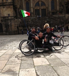 Pietro Scidurlo, a bordo della sua handbike, è arrivato a Santiago la mattina di oggi, venerdì 21 giugno. Come nel 2012, c’è arrivato a forza di braccia, lui che è in sedia a rotelle dalla nascita. Ma rispetto allo scorso anno, questo secondo viaggio è stato ancor più duro, come ci ha spiegato raggiunto telefonicamente: «Il meteo è stato un disastro: vento, acqua e freddo. Oggi è stata la prima giornata di sole dopo una settimana di pioggia continua» ci racconta la sua voce un po’ provata dalla fatica. Ha affrontato anche la tappa dell’Alto do San Roque in condizioni estreme, tra febbre, freddo e pioggia insistente, sempre accompagnato dal padre e dall’amico Benito "Benny boy" Manolo, che ha deciso di affiancarlo dopo aver letto lo scorso anno della sua passione.