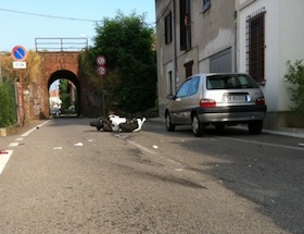 Incidente tra un motorino e un'auto intorno alle 18.30 all'incrocio con via Prealpi, proprio di fronte al ponticello della ferrovia