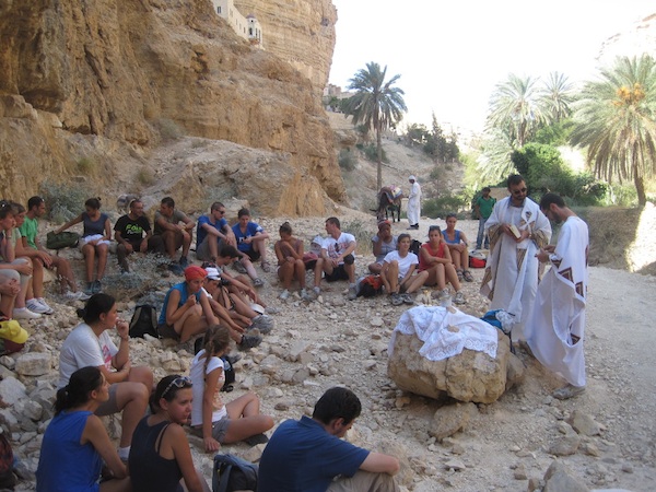 Dopo un visita a Gerico, sia alla città nuova che a quella antica, partiamo per una camminata nel deserto alla volta della Laura di San Giorgio in Koziba… era la strada “da Gerusalemme a Gerico”, quella che anche Gesù aveva percorso tante volte e che raccontava nella parabola del buon samaritano. Il sole ci cuoce. Camminiamo in fila indiana con una vista spettacolare: deserto, un dirupo alla nostra sinistra, un cielo azzurro senza una nuvola… Una meraviglia. Arriviamo a San Giorgio, un monastero ortodosso abitato da soli quattro monaci, circondato da piccole abitazioni degli eremiti, scavate nella roccia a cui si accede solo con fragili scale di legno.