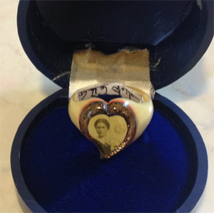 (foto: l’anello di corno. La foto al centro ritrae la moglie dell’artigliere e il figlioletto Franco che custodisce con grande gratitudine questo prezioso oggetto)