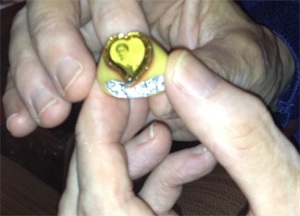 (foto: l’anello di corno. La foto al centro ritrae la moglie dell’artigliere e il figlioletto Franco che custodisce con grande gratitudine questo prezioso oggetto)