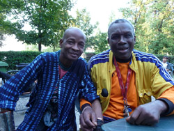 Un’idea, nove attori, cinque drammaturghi, tre musicisti, oltre duecento anni di storia. Sono questi i numeri di un progetto teatrale unico in Italia che ha preso vita nelle sale del Castello di Monteruzzo a Castiglione Olona. Una residenza teatrale promossa da Atelier Teatro di Milano, sotto la direzione artistica di Mamadou Dioume (nella foto con Kossi Efoui) attore, regista teatrale e pedagogo senegalese. Per tre settimane, dal 13 al 2 settembre, attori, musicisti e drammaturghi lavorano insieme negli ambienti del Castello per dare vita alla sceneggiatura e realizzare un vera e propria rappresentazione di corti teatrali. Il risultato è Di corte in corti che verrà presentato in anteprima nella piazza centrale di Castiglione sabato 31 agosto alle 17.00, prima del debutto il 2 ottobre al Teatro Elfo Puccini di Milano.
