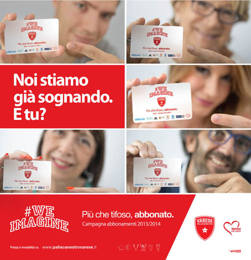 La creazione dell’intera campagna "We Imagine" (foto sotto: coach Frates "circondato" dallo slogan) è stata frutto di un lavoro di squadra importante, nel quale la Pallacanestro Varese ha investito risorse per potenziare gli uffici e ha coinvolto professionisti esterni come Giorgio Gaspari e lo Studio Trenta, autore della t-shirt celebrativa che sarà distribuita agli abbonati. «Ci piacerebbe fare meglio della scorsa stagione – continua Lo Nero – Non faccio cifre (nel 2012-13 le tessere furono oltre 2.500 ndr) ma spero che chi era abbonato rinnovi, così tutti i nostri nuovi amici potranno far lievitare il numero totale».