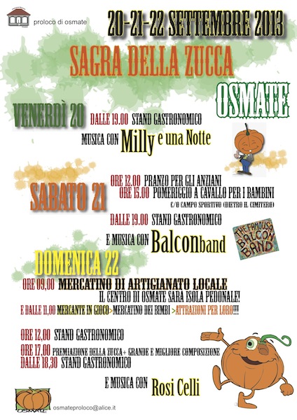 La festa della zucca è giunta ormai alla sua diciassettesima edizione. Nata come un piccolo evento all’interno degli spazio del vecchio circolo, dove attualmente si trova la Trattoria della zucca, negli anni è diventato un evento sempre più grande e complesso da organizzare. L’ìdea iniziale venne da un gioco sul nome storico degli Osmatesi, le "Zucc d’Üsma". Se ne occupano i volontari della Pro Loco.