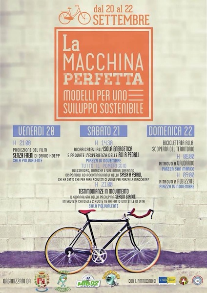 La macchina perfetta? La bicicletta. Sarà lei la protagonista della tre giorni albizzatese organizzata dal 20 al 22 settembre dall’associazione Verdi Orizzonti, dall’associazione Mtb 92, da "Bicipiace" e dal comune di Albizzate.