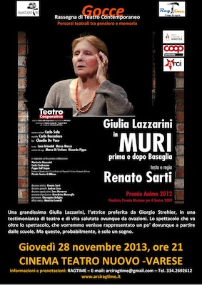 Giovedì 28 novembre, alle 21, al Cinema Teatro Nuovo a Varese in scena Giulia Lazzarini, interprete dello spettacolo "Muri Prima e dopo Basaglia" per la regia di Renato Sarti.