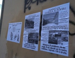 Molti gli striscioni esposti, qualcuno anche messo contro i muri degli edifici della città. “Terrorista è chi devasta il territorio, sgombera e sfratta. Libertà per chi lotta. Toffo, Giobbe, Chiara, Mattia, Nico, Claudio Libere/i subito” recitavano i volantini. Mentre i manifesti indicavano slogan come “magistrati e giornalisti, veri terroristi”, “Aumenta la benzina, aumenta il prosciutto, non paghiamo niente e prendiamo tutto”, “Su su gli affitti vanno su, occupiamo le case e non paghiamo più”.